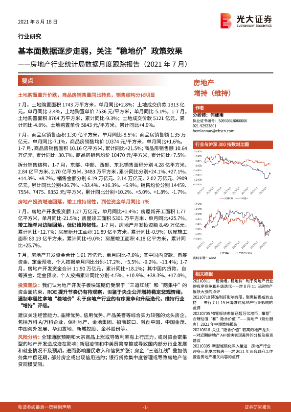 【光大证券】【20210818】房地产行业统计局数据月度跟踪报告:基本面数据逐步走弱,关注“稳地价”政策效果-11页