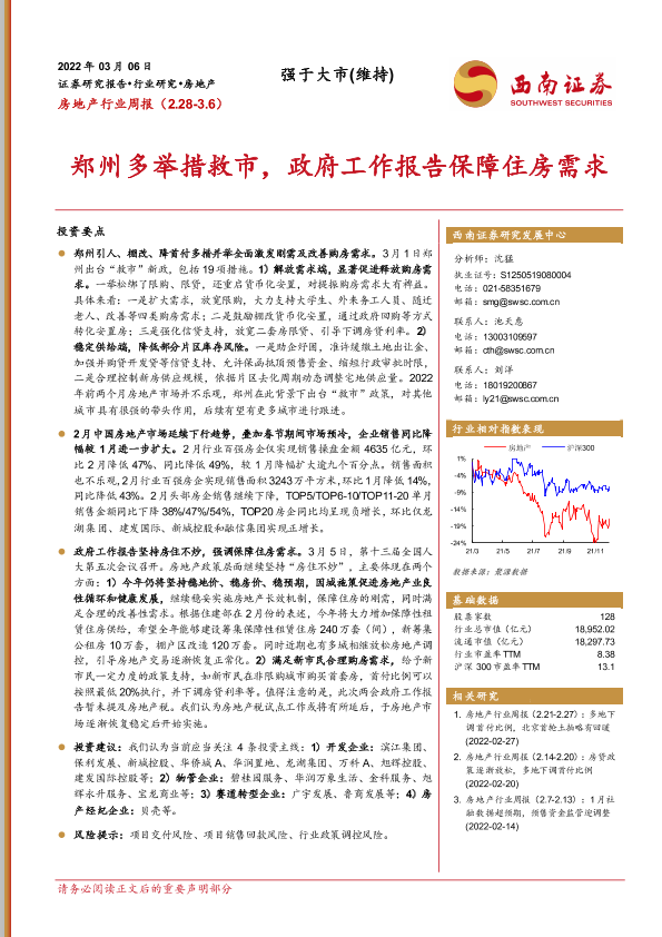 【西南证券】【20220306】房地产行业周报:郑州多举措救市,政府工作报告保障住房需求-15页