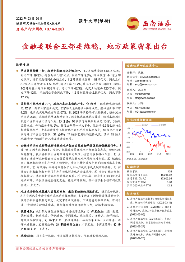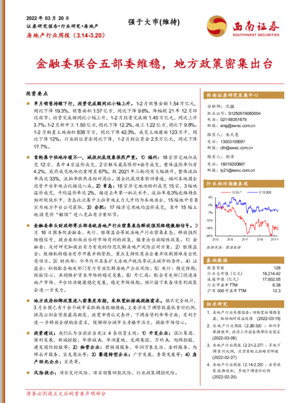 【西南证券】【20220320】房地产行业周报:金融委联合五部委维稳,地方政策密集出台-15页