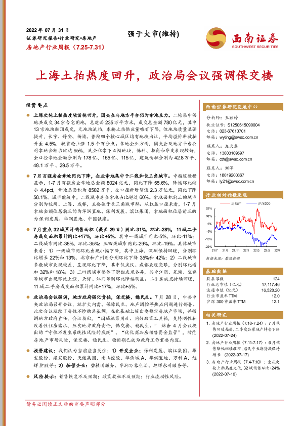 【西南证券】【20220731】房地产行业周报:上海土拍热度回升,政治局会议强调保交楼-14页