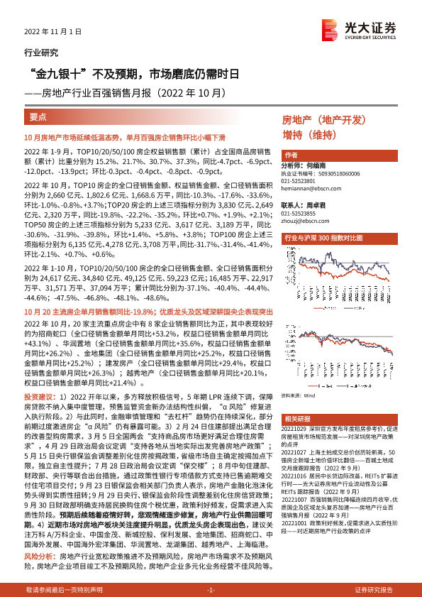 【光大证券】【20221101】房地产行业百强销售月报:‘金九银十’不及预期,市场磨底仍需时日-10页