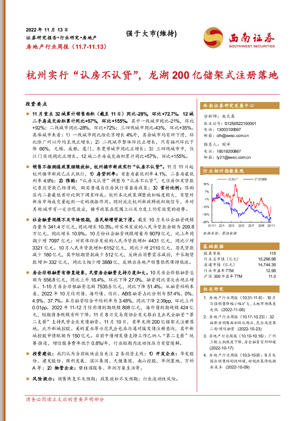 【西南证券】【20221113】房地产行业周报:杭州实行“认房不认贷”,龙湖200亿储架式注册落地-15页