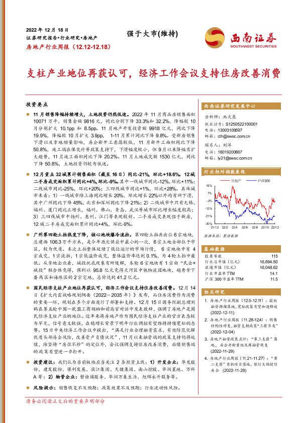 【西南证券】【20221218】房地产行业周报:支柱产业地位再获认可,经济工作会议支持住房改善消费-16页