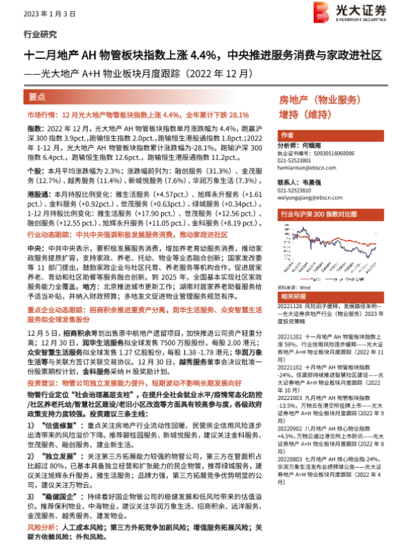 【光大证券】【20230103】十二月地产AH物管板块指数上涨4.4%,中央推进服务消费与家政进社区-12页