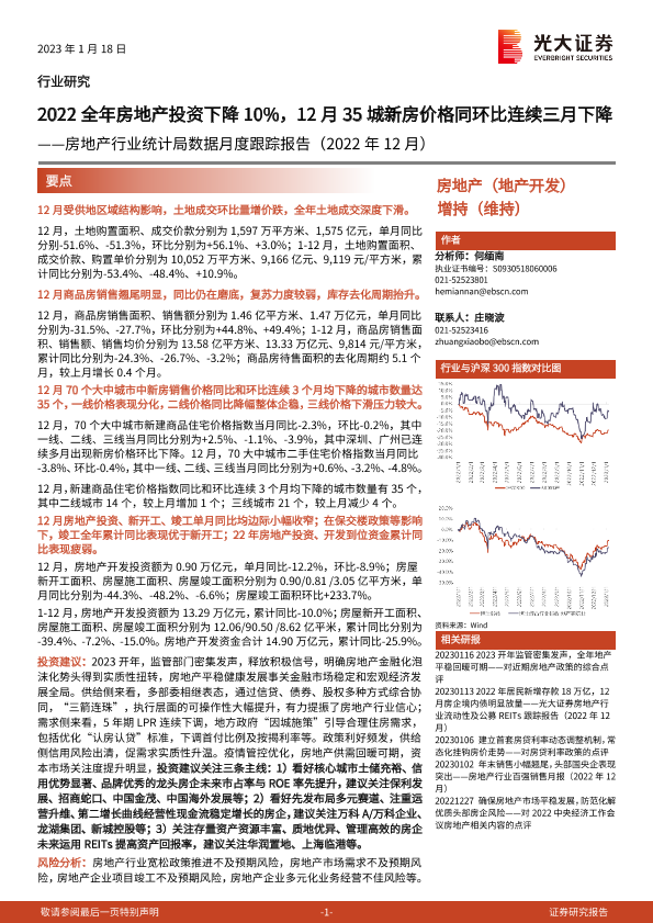 【光大证券】【20230118】2022全年房地产投资下降10%,12月35城新房价格同环比连续三月下降-17页