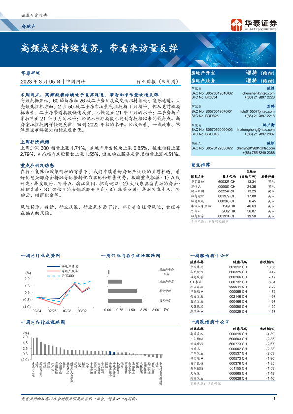 【华泰证券】【20230305】房地产行业周报:高频成交持续复苏,带看来访量反弹-16页