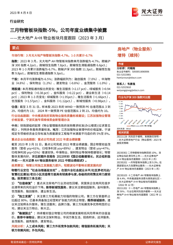 【光大证券】【20230404】三月物管板块指数-5%,公司年度业绩集中披露-12页