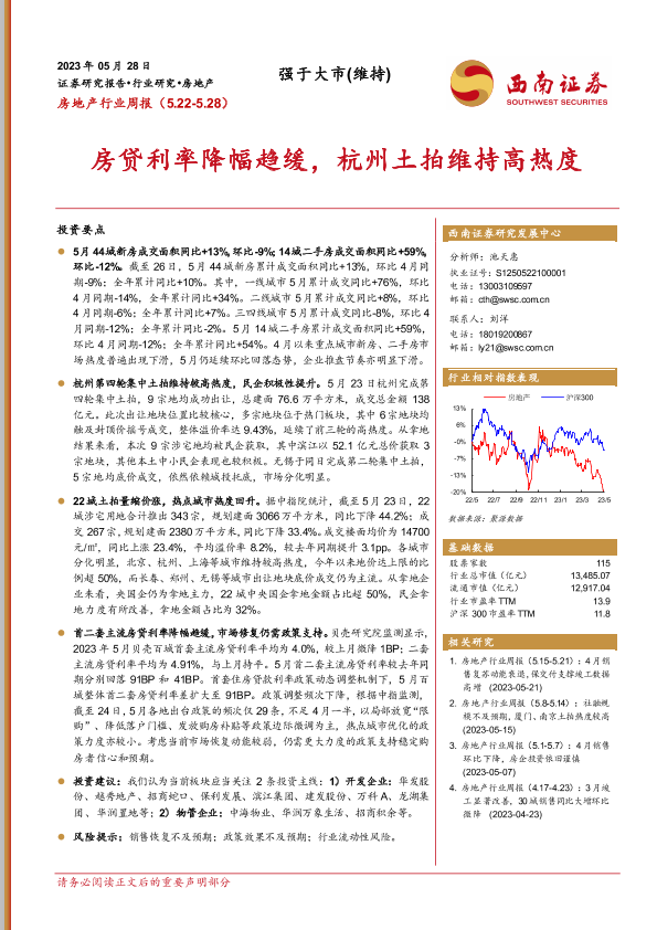 【西南证券】【20230528】房地产行业周报:房贷利率降幅趋缓,杭州土拍维持高热度-13页