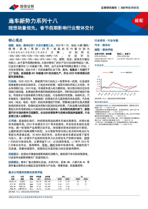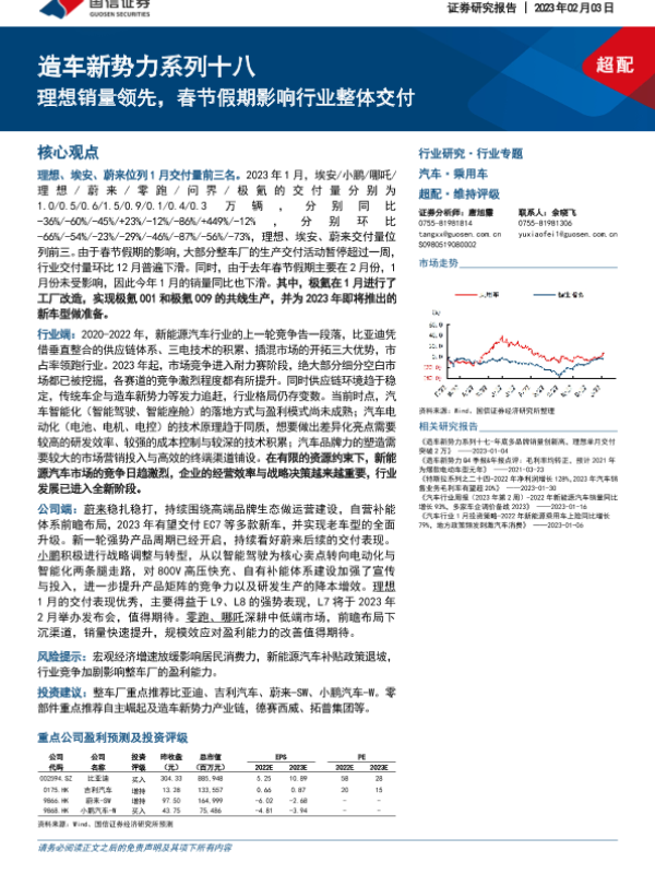 【国信证券】【20230203】汽车行业造车新势力系列十八:理想销量领先,春节假期影响行业整体交付-30页