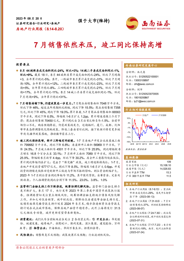 【西南证券】【20230820】7月销售依然承压,竣工同比保持高增-15页