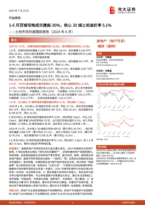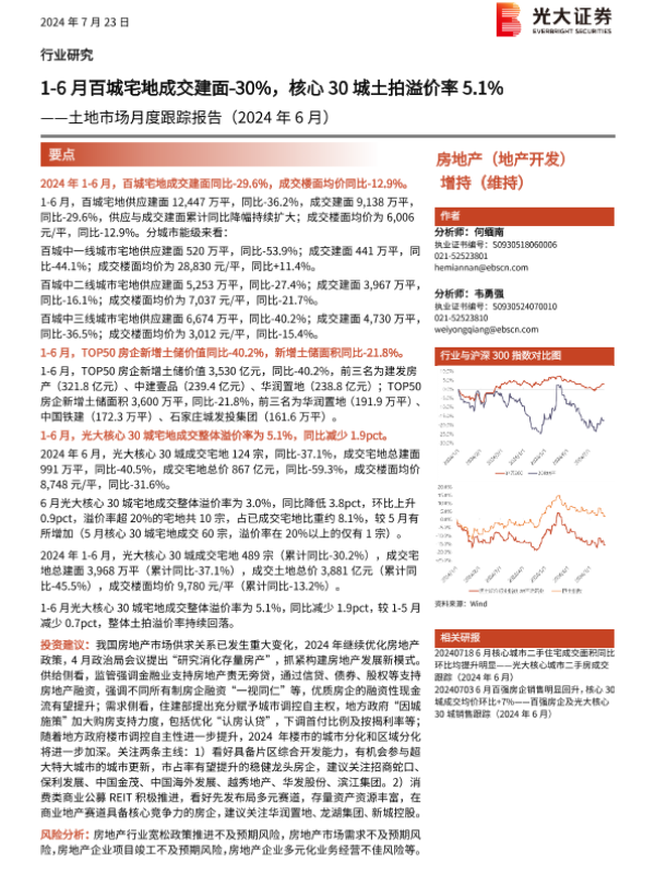 【光大证券】【20240723】土地市场月度跟踪报告:1-6月百城宅地成交建面-30%,核心30城土拍溢价率5.1%-15页