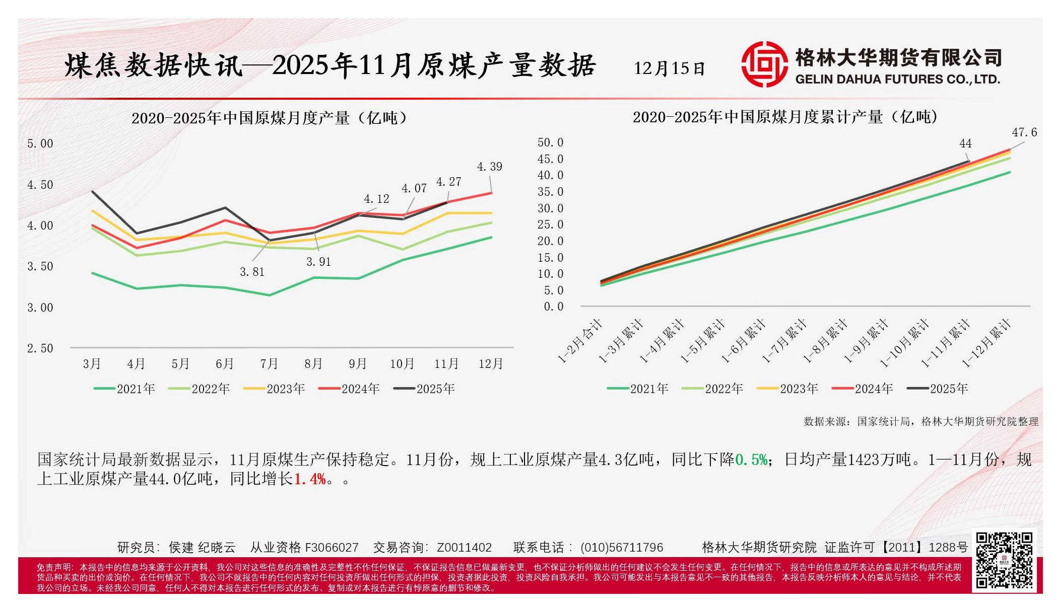 【格林大华期货研究院】【202512】煤焦数据快讯--2025年11月原煤产量数据-1页