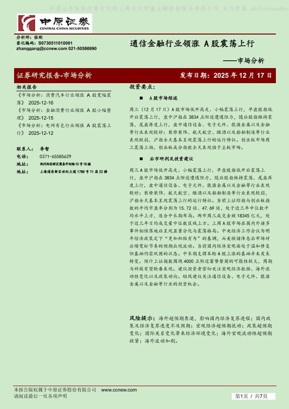 【中原证券】【202512】通信金融行业领涨 A股震荡上行-7页