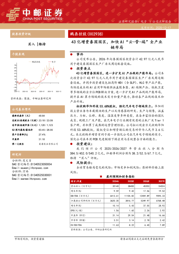 鹏鼎控股 收购华阳科技 AI产业链 泰国园区 汽车电子