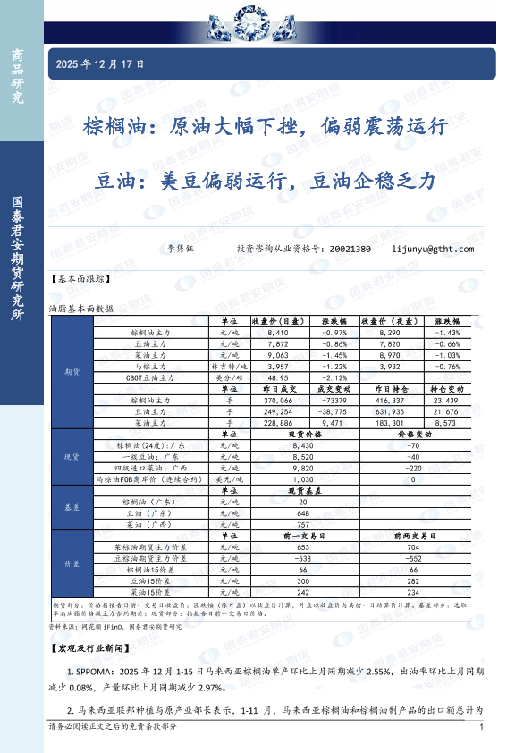 【国泰君安期货】【202512】棕榈油:原油大幅下挫,偏弱震荡运行;豆油:美豆偏弱运行,豆油企稳乏力-3页