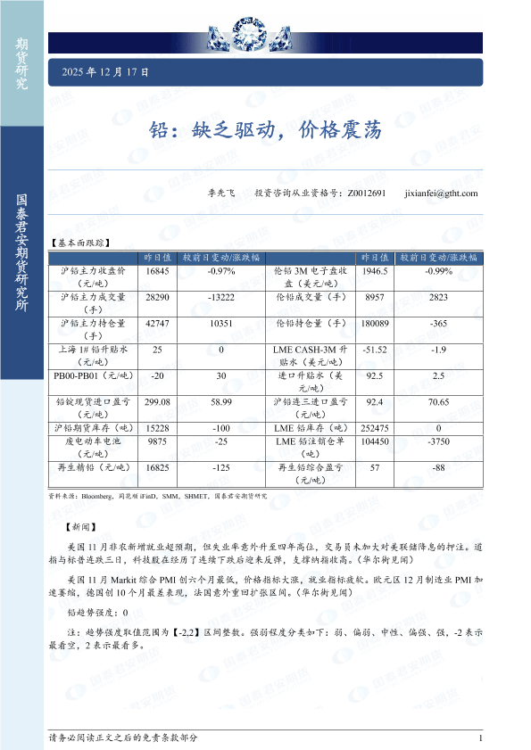 【国泰君安期货】【202512】铅:缺乏驱动,价格震荡-2页