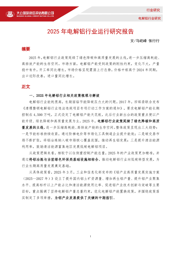 【大公国际】【2025】2025年电解铝行业运行研究报告-7页