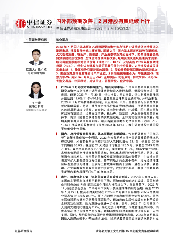 【中信证券】【20230201】港股策略组合_2023年2月:内外部预期改善,2月港股有望延续上行-16页