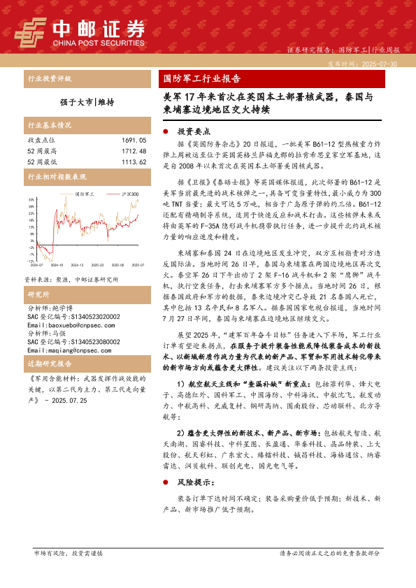 【中邮证券】【202507】国防军工行业报告:美军17年来首次在英国本土部署核武器,泰国与柬埔寨边境地区交火持续-14页