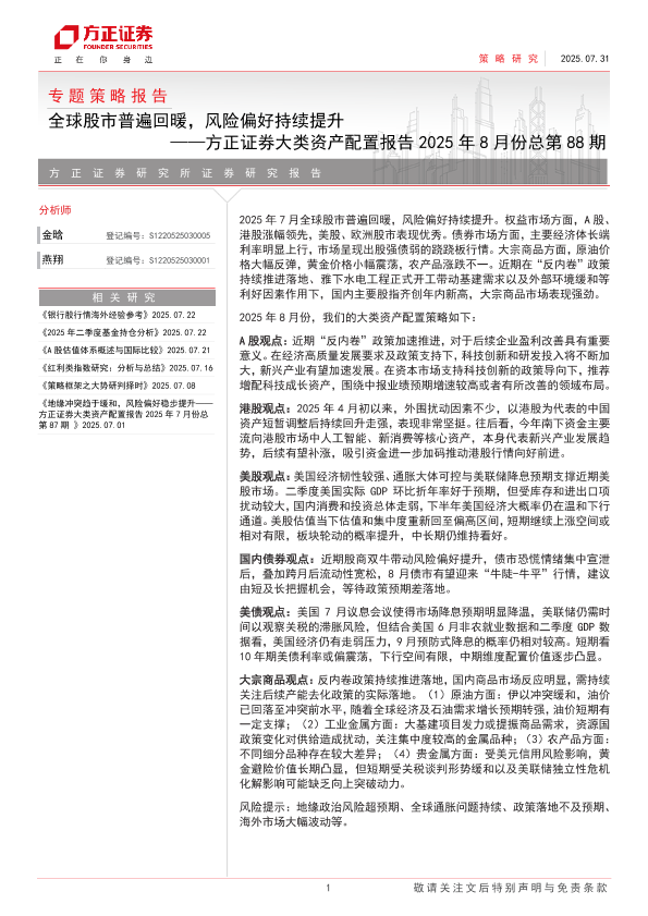 【方正证券】【202508】大类资产配置报告2025年8月份总第88期:全球股市普遍回暖,风险偏好持续提升-28页