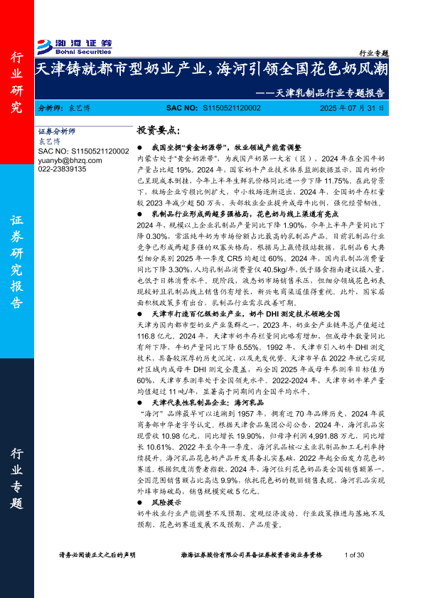 【渤海证券】【202507】天津铸就都市型奶业产业,海河引领全国花色奶风潮-30页