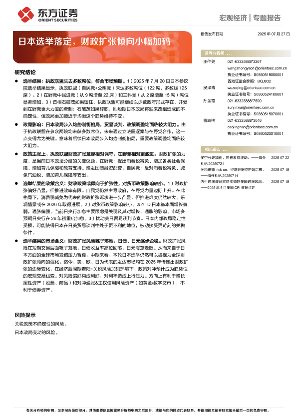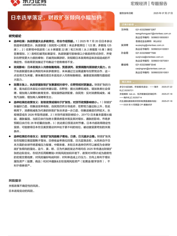 【东方证券】【202507】日本选举落定,财政扩张倾向小幅加码-11页