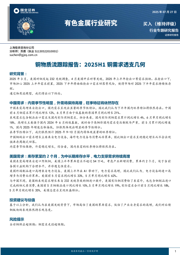 【国金证券】【202507】有色金属行业铜物质流跟踪报告:2025H1铜需求透支几何-10页
