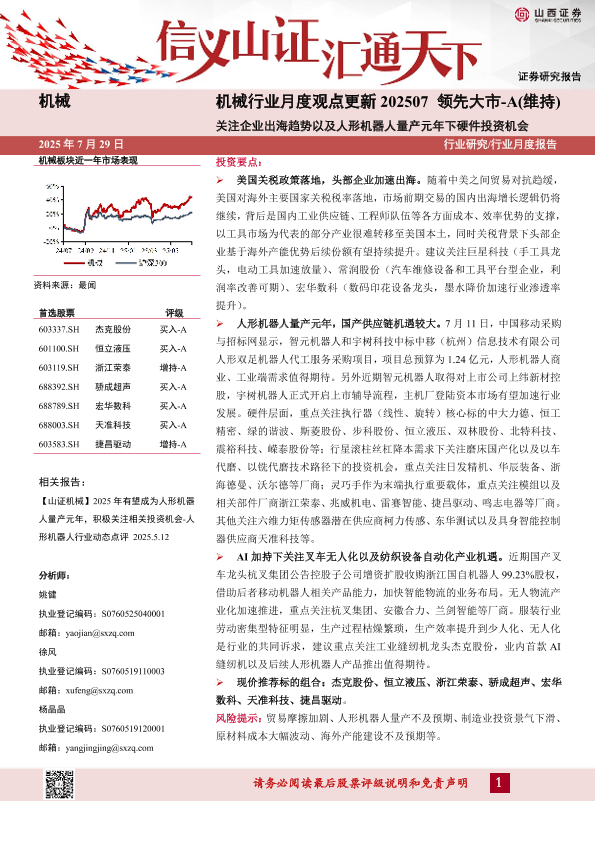 【山西证券】【202507】机械行业月度观点更新202507:关注企业出海趋势以及人形机器人量产元年下硬件投资机会-10页