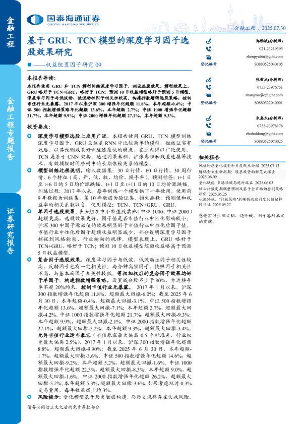 【国泰海通证券】【202507】基于 GRU、TCN模型的深度学习因子选股效果研究-26页