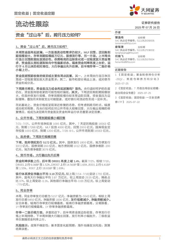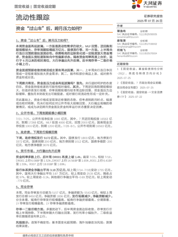 【天风证券】【202507】流动性跟踪:资金“过山车”后,跨月压力如何?-22页