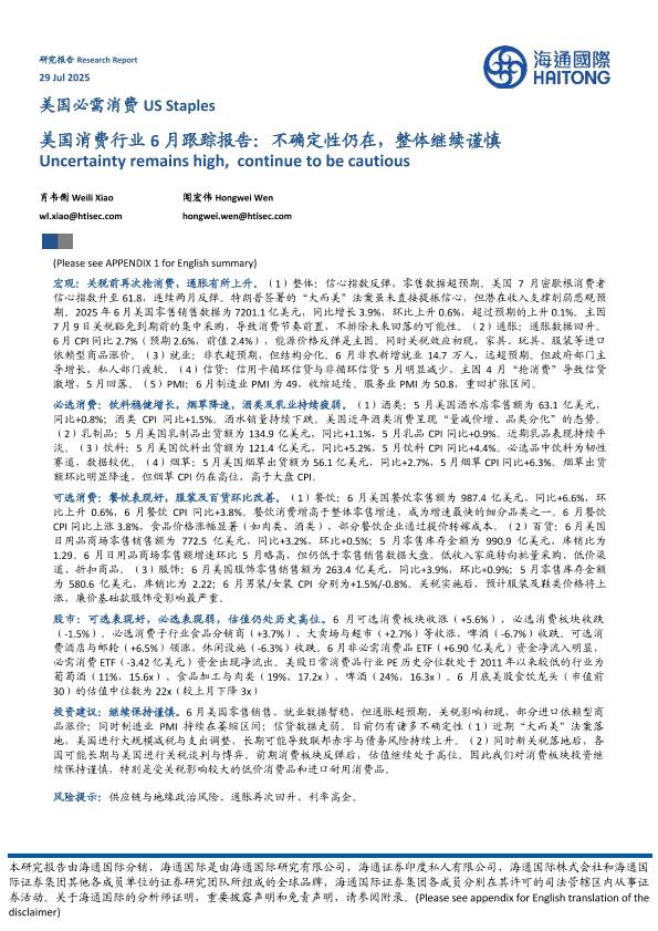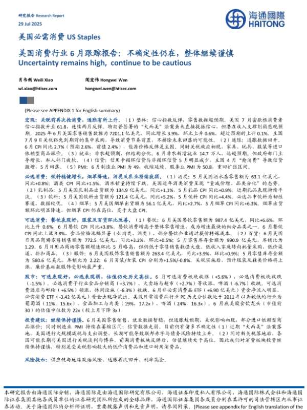 【海通国际】【202507】美国必需消费 US Staples 美国消费行业 6月跟踪报告:不确定性仍在,整体继续谨慎-25页