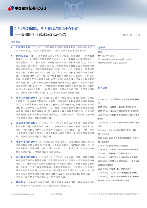 【中国银河证券|CGS】【202507】美联储7月议息会议点评报告:7月决议偏鹰,9月降息窗口还在吗?-10页