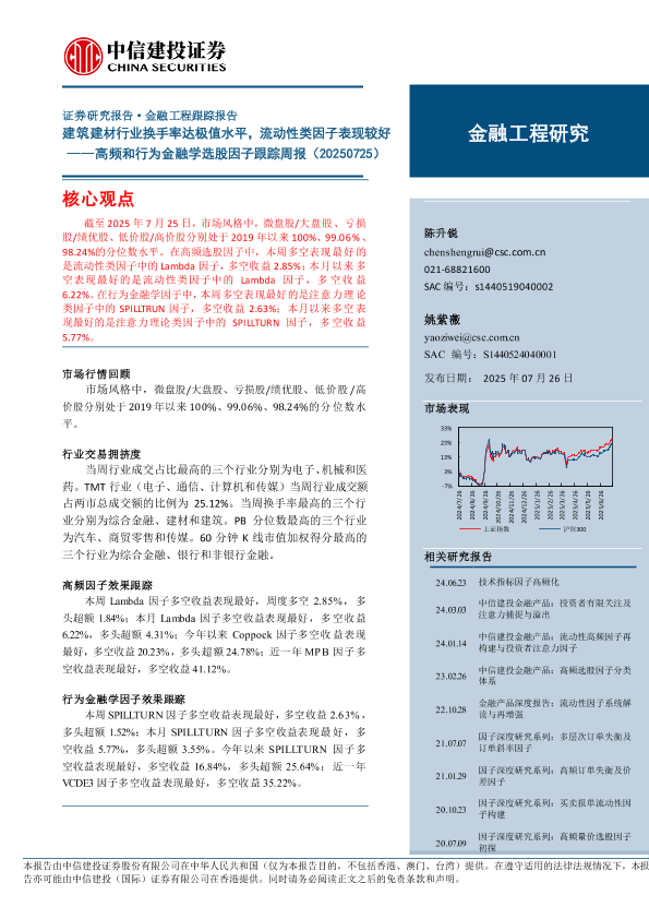【中信建投证券】【202507】高频和行为金融学选股因子跟踪周报:建筑建材行业换手率达极值水平,流动性类因子表现较好-34页
