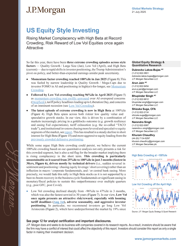 【J.P. Morgan】【202507】Global Equity Strategy & Quantitative Research Rising Market Complacency with High Beta Crowding-16页