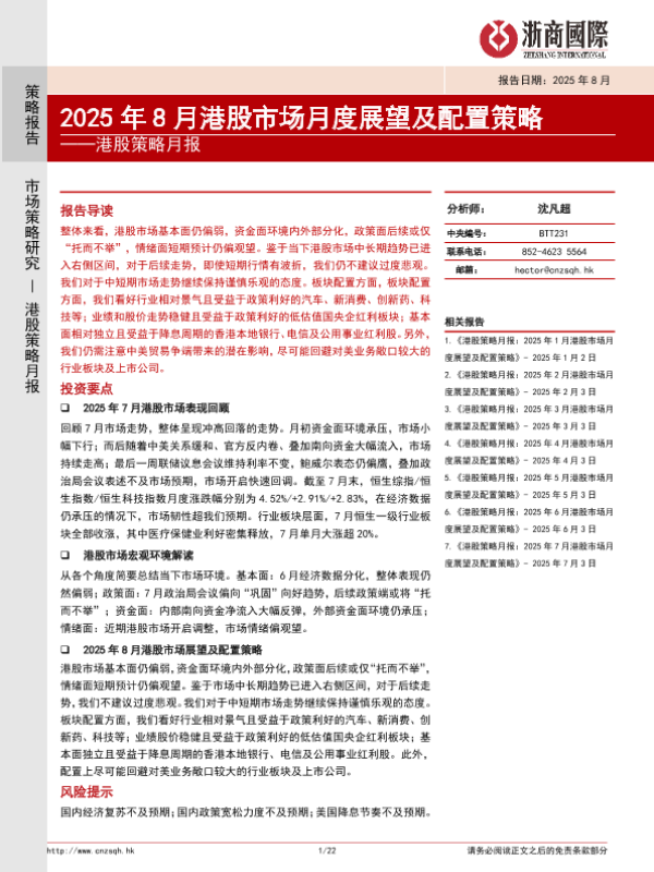 【浙商国际】【202508】港股策略月报:2025年8月港股市场月度展望及配置策略-22页