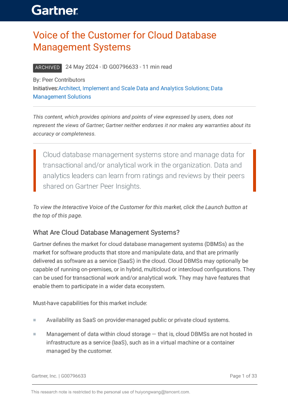 【Gartner&Inc.】【202405】Voice of the Customer for Cloud Database Management Systems-33页