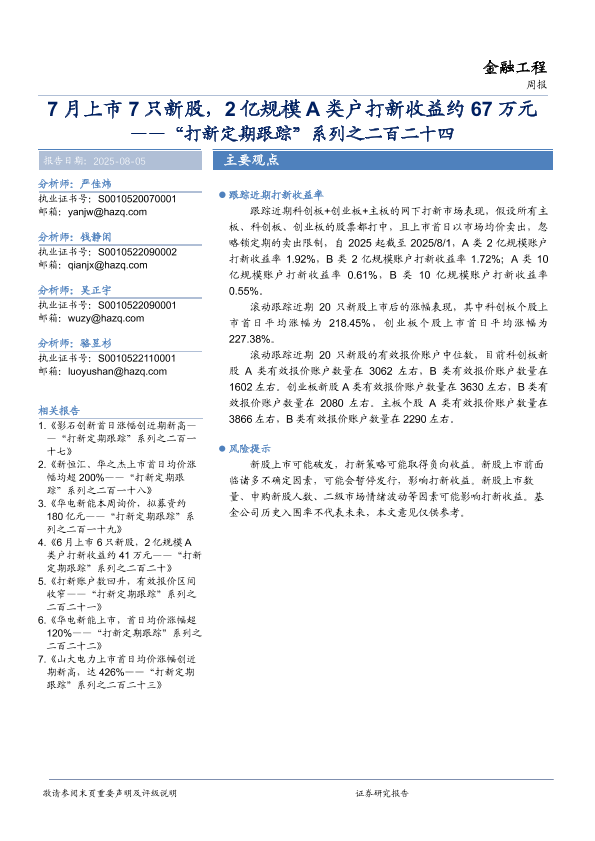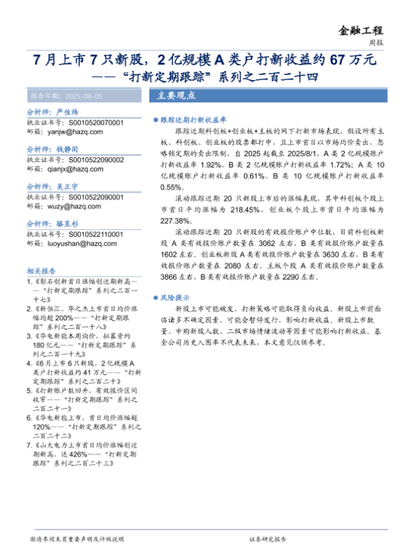 【华安证券】【202508】7月上市7只新股,2亿规模A类户打新收益约67万元-14页