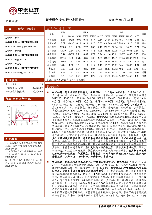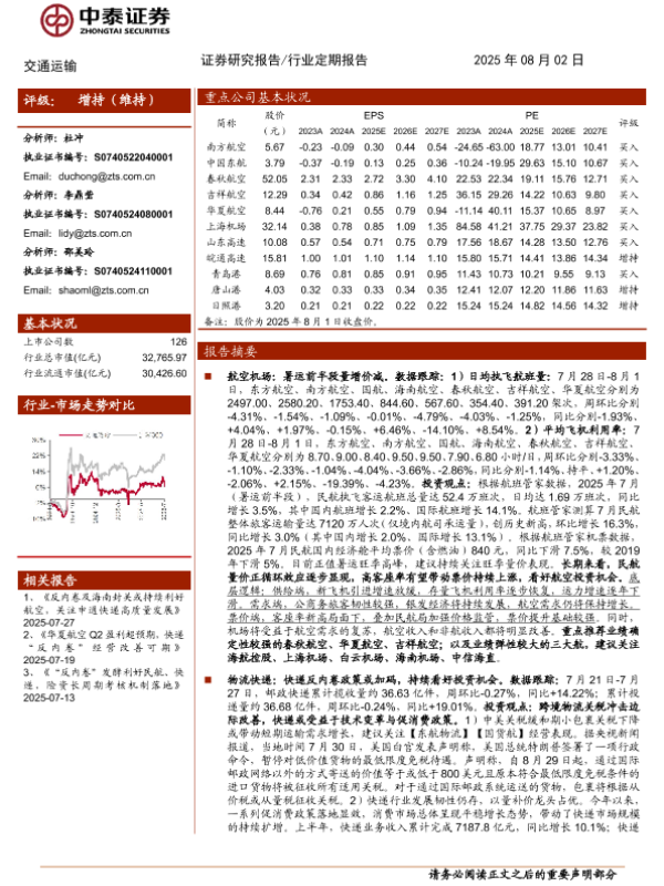 【中泰证券】【202508】交通运输行业:持续推荐反内卷催化下的航空及快递投资机遇-24页