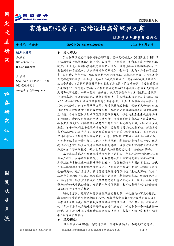 【渤海证券】【202508】震荡偏强趋势下,继续选择高等级拉久期――信用债 8月投资策略展望-17页