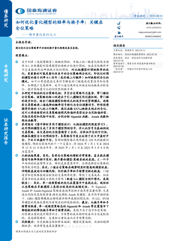 【国泰海通证券】【202507】债市量化系列之六:如何优化量化模型的赔率与换手率,关键在仓位策略-21页