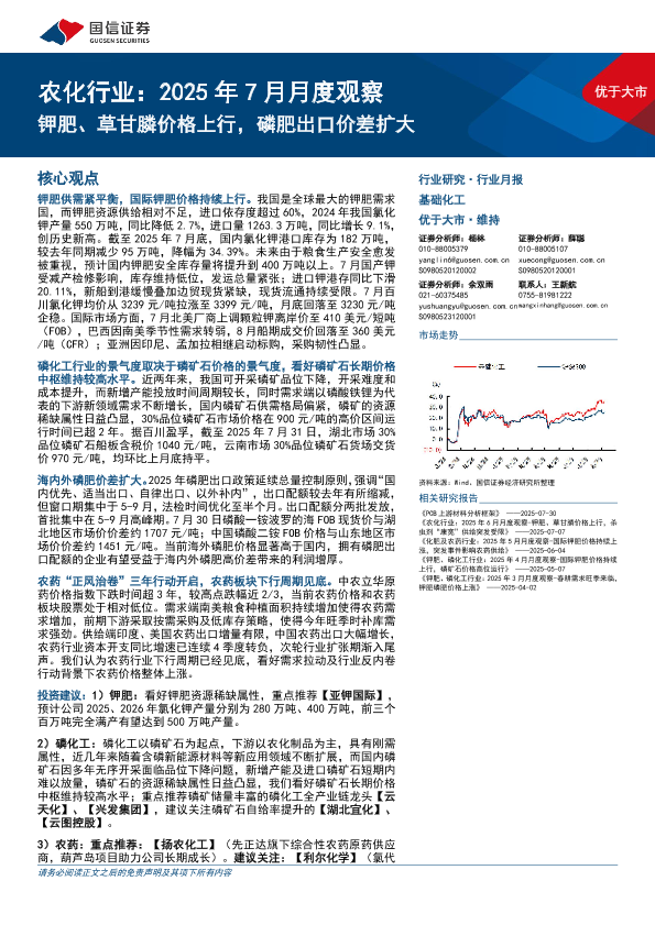 【国信证券】【202507】农化行业:2025年7月月度观察,钾肥、草甘膦价格上行,磷肥出口价差扩大-29页