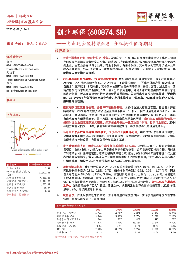 【华源证券】【202508】创业环保(600874)自由现金流持续改善,分红提升值得期待-13页