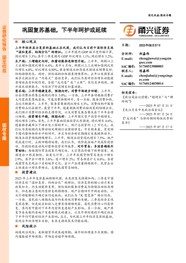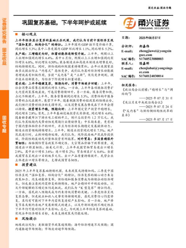 【甬兴证券】【202508】固收专题:巩固复苏基础,下半年呵护或延续-16页