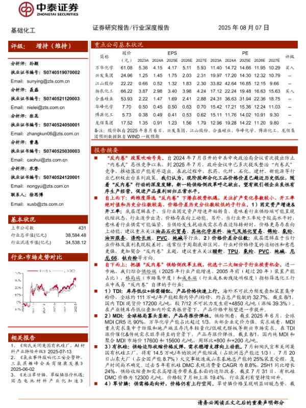 【中泰证券】【202508】基础化工行业:反内卷号声响起,两维度梳理十二大潜在受益化工子行业-40页