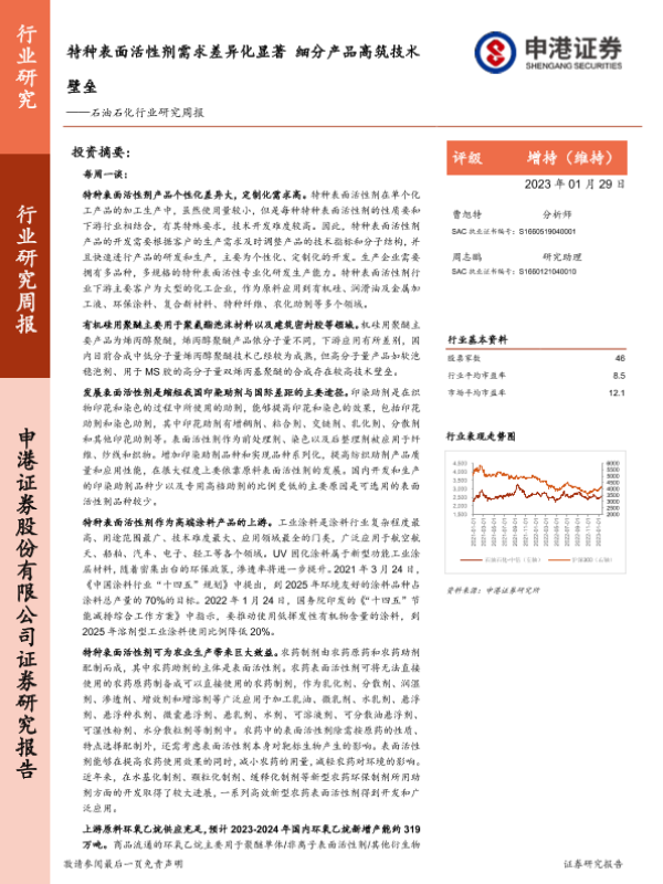 【申港证券】【20230129】石油石化行业研究周报:特种表面活性剂需求差异化显著 细分产品高筑技术壁垒-15页