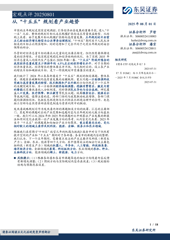 【东吴证券】【202508】宏观点评 20250801 从“十五五”规划看产业趋势-18页