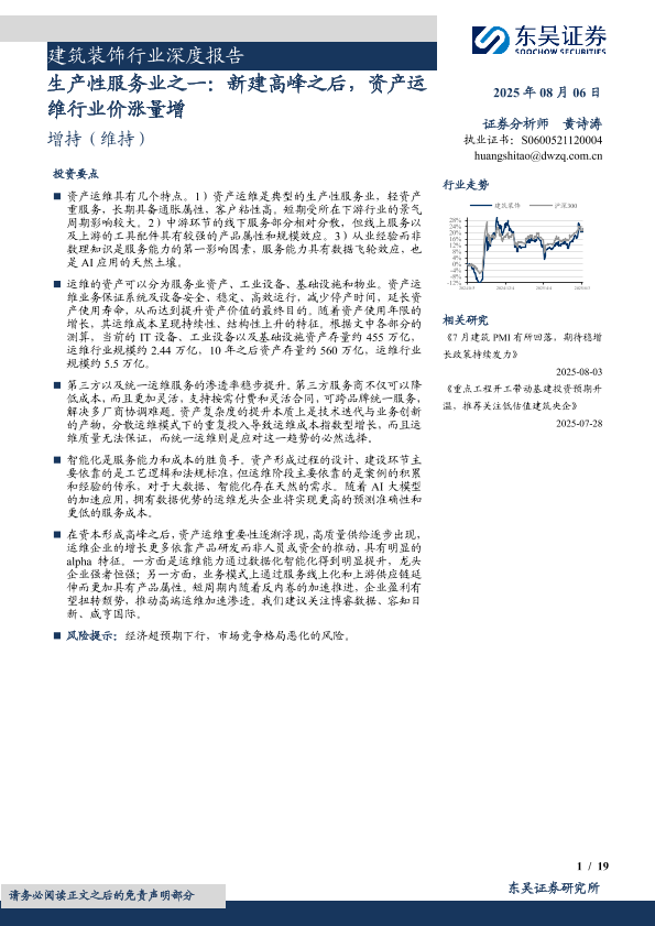【东吴证券】【202508】建筑装饰行业深度报告:生产性服务业之一,新建高峰之后,资产运维行业价涨量增-19页