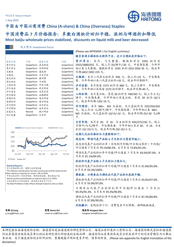 【海通国际】【202507】中国消费品7月价格报告:多数白酒批价回归平稳,液奶与啤酒折扣降低-14页
