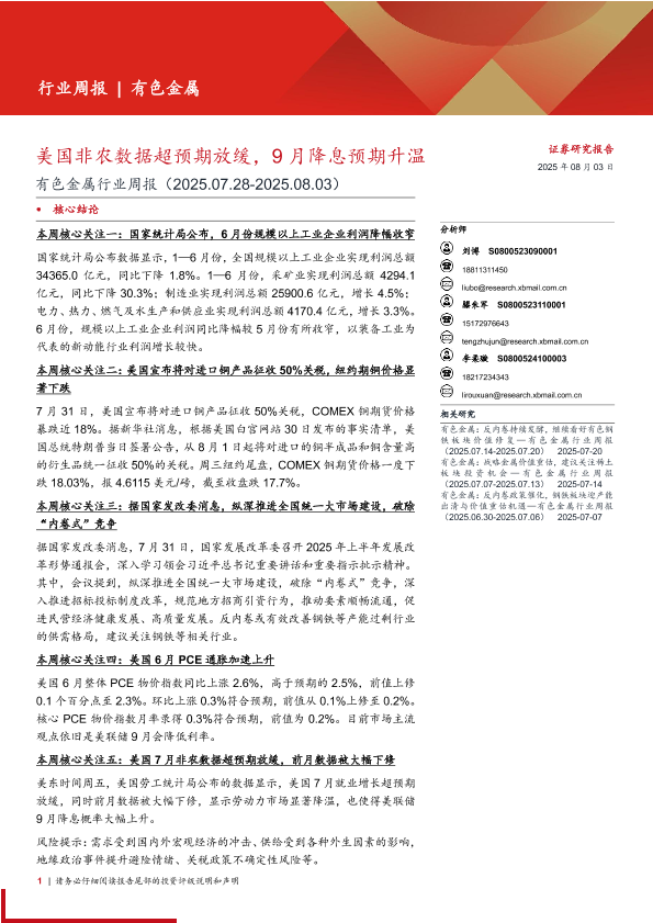 【西部证券】【202508】有色金属行业周报(2025.07.28-2025.08.03)美国非农数据超预期放缓,9月降息预期升温-12页