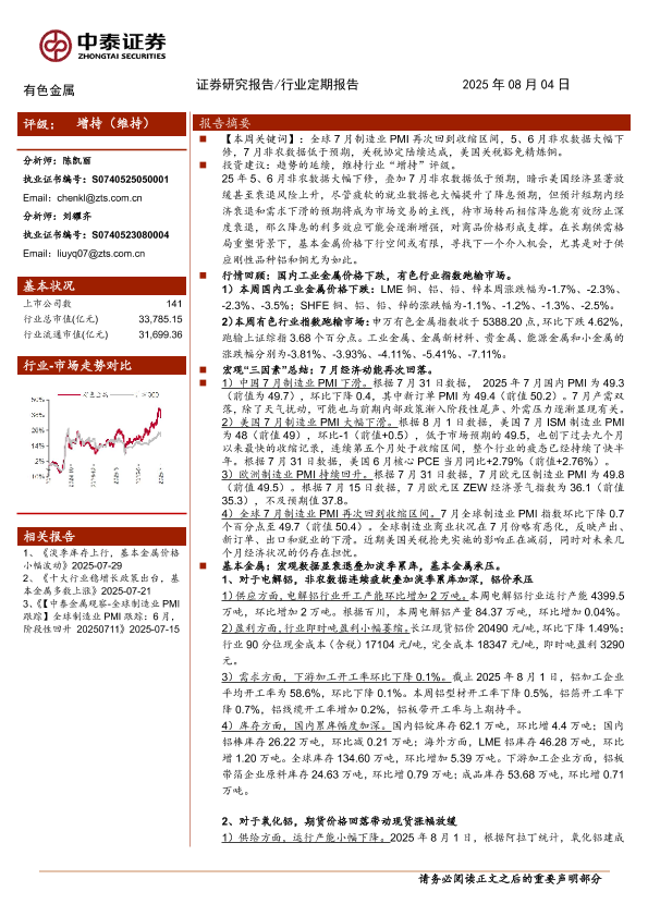 【中泰证券】【202508】有色金属:宏观数据显衰退叠加淡季累库,基本金属承压-25页